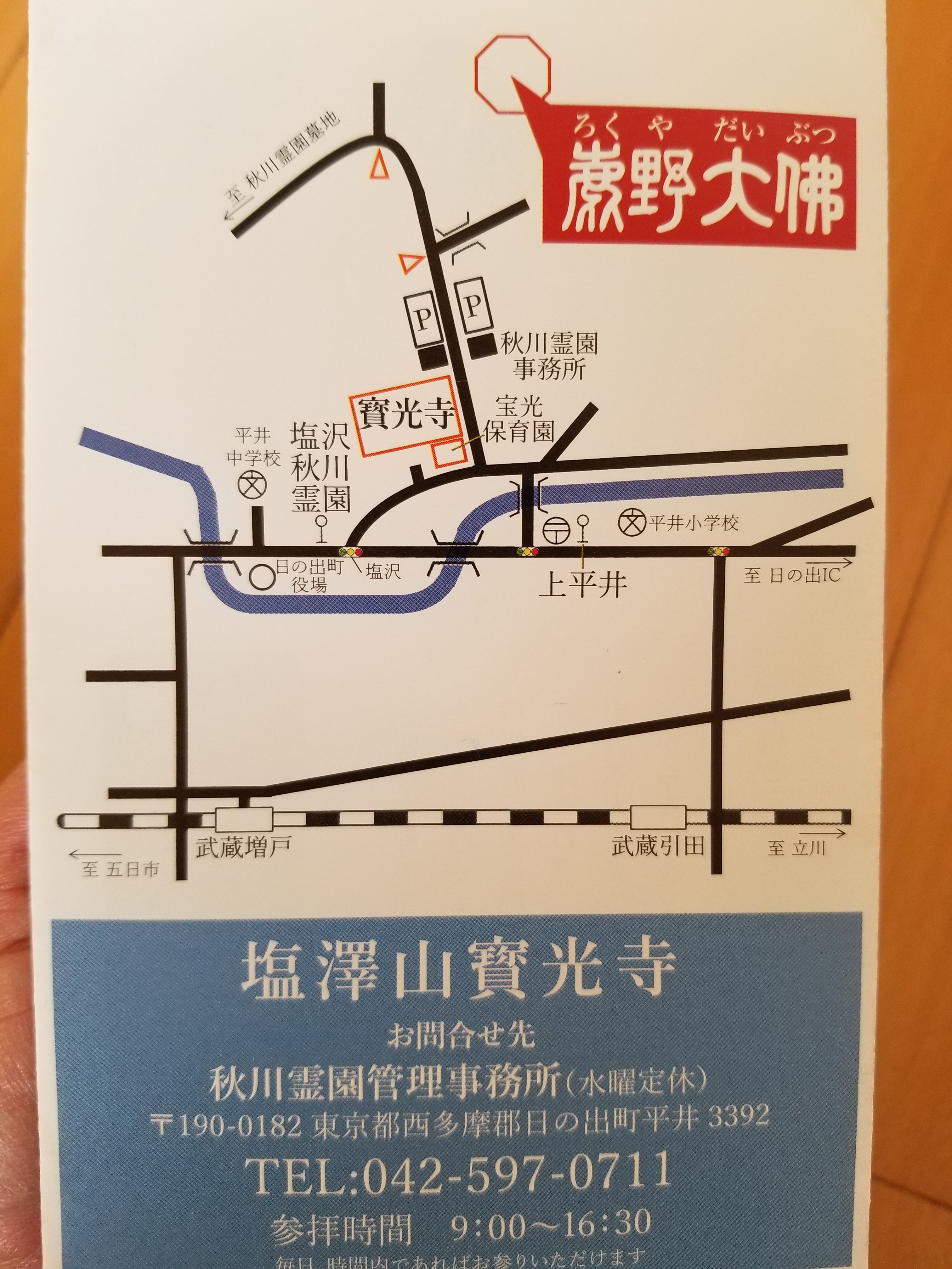 車:首都圏中央連絡自動車道日の出IC下車→日の出インター(都道184号)左折→1.64km直進→平井郵便局(右手)のすぐ先の信号を右折→173m直進→突き当りを左折→100m直進→秋川霊園の手前を右折→171m直進→左手が宝光寺