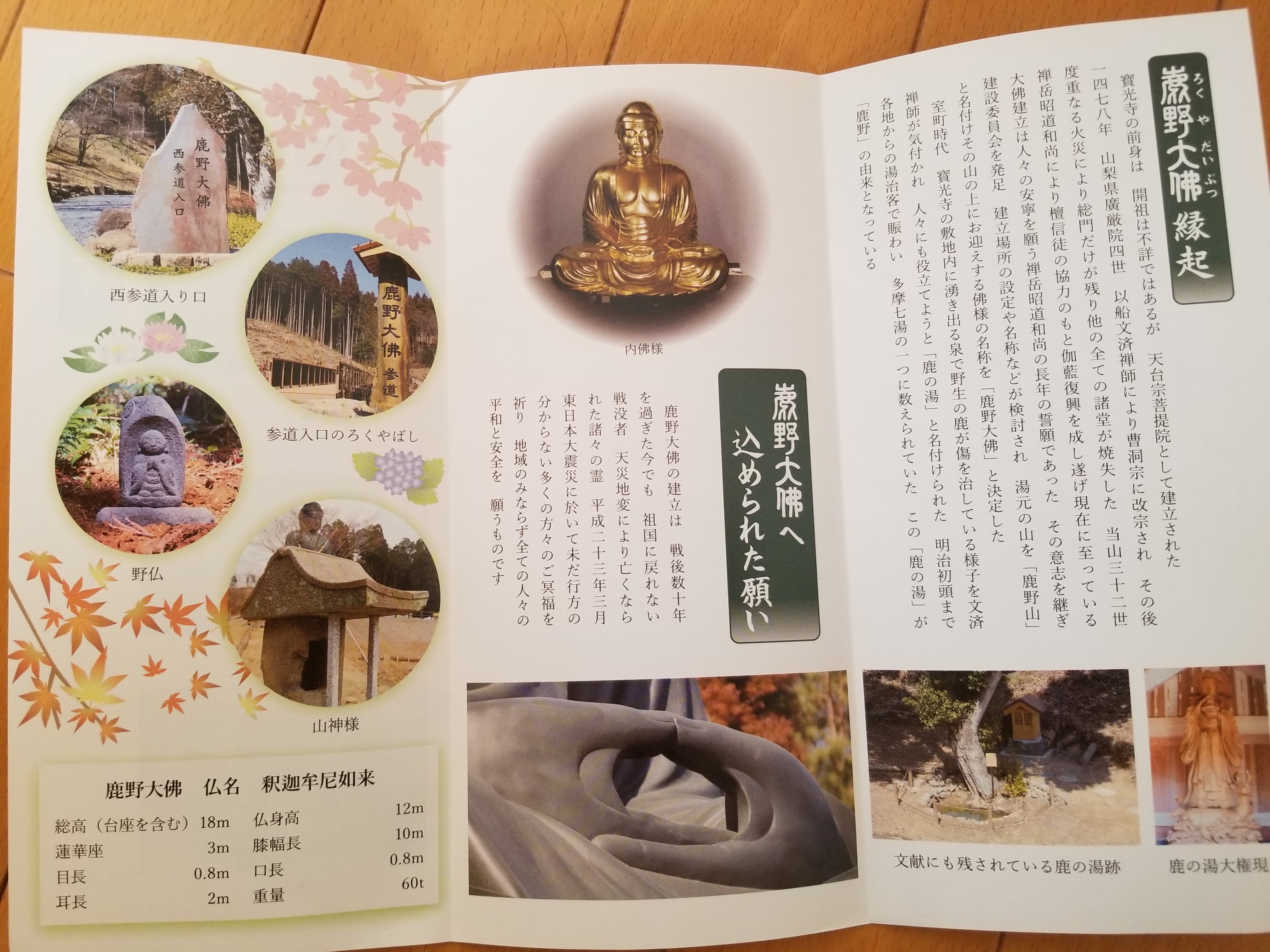 【名前の由来】宝光寺の敷地内には500年前、湧き出る泉で野生の鹿が傷を治していることもあり、鹿の湯と名づけられました。その湯元の山を鹿野山と名付け、それに因んで「鹿野大仏」と命名しました。
